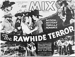 The Rawhide Terror was the final screen collaboration between Victor Adamson and George Kesterson (under his stage name Art Mix), the latter of whom Adamson's company was named after.[2] Originally envisioned as a movie serial titled The Pueblo Terror,[3] it was later cut from its original 52 minute length and converted into a 46–47 minute feature film when funding for the film fell through.[4] In spite of this, the film has been incorrectly listed under its original 52 minute runtime.[5][6][7][8]