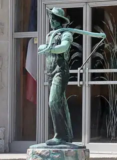 The Reaper is a public art work by artist Gustav Bohland, located on the south side of Milwaukee, Wisconsin.[1] The bronze sculpture depicts an agricultural worker dressed in overalls and a wide-brimmed hat. One hand rests against his hip, and the other hand grasps the snath of a scythe that rests across his shoulders. The tool's toe and cline hang behind the figure's back. His boots rest on a small round base mounted on a circular flagstone pedestal.[2] The artwork is located at the former corporate headquarters of Froedtert Malting Company which is now the US headquarters of MaltEurop.
