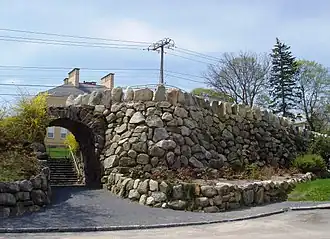 The Rockery was created in 1882 as a memorial for North Easton's citizens lost in the American Civil War, a public area, and a carriage promenade with views of North Easton. Funded by Oliver Ames & Sons, the monument consists of boulders heaped into a long, asymmetric mound across a rustic archway that echoes those of H. H. Richardson's nearby Oakes Ames Memorial Hall.