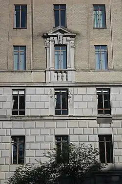 The facade contains metal, stone, and terracotta decorations.[6] These details include pilasters, engaged columns, rounded and triangular broken pediments, and balustrades, as well as smaller motifs such as roundels, scrolls, urns, cartouches, garlands, and consoles.[28] The lowest three stories of the facade are made of rusticated blocks of limestone, while the rest of the building is clad with beige brick.[28][22][21] The limestone blocks on the first and second stories are vermiculated.[28] Above the base, there is a small amount of terracotta ornament, which is used to emphasize the otherwise plain brick facade.[6][40] The ornament on the upper stories is oversized, allowing it to be seen from the ground.[40]