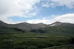 The Sawtooth is a jagged arête joining Mount Bierstadt to (eventually) Mount Blue Sky in the Front Range of central Colorado.[4] The three points along this arête resemble the teeth of a saw, leading to its name. The southeast wall of the arête is the head of the cirque above Abyss Lake, while its northwest wall is the cirque at the head of a valley near the summit of Guanella Pass. The northeast end of the sawtooth joins directly to the shoulder of Mount Spalding, from which a second (and slightly less abrupt) arête leads southeast to Mount Blue Sky. This second arête divides the glacial valley of Abyss Lake to the southwest from the cirque of Summit Lake to the northeast.