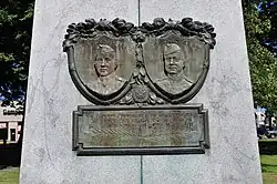 On the left flank of the pedestal is a bronze bas relief with an American Legion insignia containing the portraits of Arthur McElfresh and Warren Grimm, two legionnaire members who died during the Armistice Day Riot. A bronze plaque reads:[2]