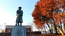 The Sentinel is an 8 foot (2.4 metres)[b] tall cast bronze sculpture of a World War I doughboy atop a granite base.[9][2] Unmodified since its placement in 1924, the artwork faces east. Over time, based on a form of transmutation, the statue has been described as taking on the likeness of Wesley Everest, the lynched Wobbly from the riot, but the NRHP form does not confirm the idea.[2]