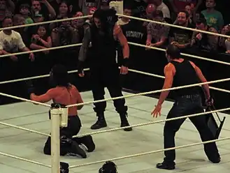 The Shield[7] was a professional wrestling stable in WWE that consisted of Dean Ambrose, Roman Reigns, and Seth Rollins.[8] The group debuted on November 18, 2012 at the Survivor Series pay-per-view.[5] The Shield was a dominant force in six-man tag team matches with an undefeated televised streak lasting from December 2012 to May 2013, during which they scored a victory at WrestleMania 29. In May 2013 at Extreme Rules, all three members of The Shield won a championship, with Ambrose winning the United States Championship while Rollins and Reigns captured the WWE Tag Team Championship. Rollins and Reigns were WWE Tag Team Champions until October 2013, and Ambrose was United States Champion until May 2014, which was a record reign for the WWE version of the championship.[9][10] As a Shield member, Reigns gained prominence by setting and equaling elimination records at the 2013 Survivor Series and the 2014 Royal Rumble events.[11][12]