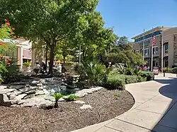Local architectural firm Alamo Architects designed The Shops at La Cantera, constructed as a single-level, garden-like "retail village" with varied storefronts, shared arcades, and subtle water features. The overall architectural style of the center has a Texas Hill Country vernacular vibe designed to ease environmental concerns about land usage and nature conservation. The shops reflect the preservation of natural landscape and evolution in modern shopping patterns.[3] Austin-native J. Robert Anderson, FASLA conceived the landscape architecture style, that also reflects Hill Country.