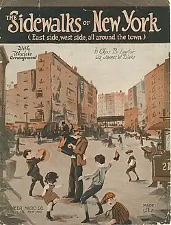 "The Sidewalks of New York" is a popular song about life in New York City during the 1890s. It was composed in 1894 by vaudeville actor and singer Charles B. Lawlor (June 2, 1852 – May 31, 1925) with lyrics by James W. Blake (September 23, 1862 – May 24, 1935). It was an immediate and long-lasting hit and is often considered a theme for New York City. Many artists, including Mel Tormé, Duke Ellington, Larry Groce, Richard Barone, and The Grateful Dead, have performed it. Governor Al Smith of New York used it as a theme song for his failed presidential campaigns of 1920, 1924, and 1928.[1][2] The song is also known as "East Side, West Side" from the first words of the chorus.