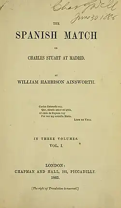 The Spanish Match is an 1865 three-volume historical novel by the British writer William Harrison Ainsworth.[1] [2] [3] It was originally serialised in Bentley's Miscellany under the alternative title House of the Seven Chimneys, a reference to the English Embassy in Spain.[4] It was then published in London by Chapman and Hall. It is based on the historic Spanish match, a proposed marriage between the English and Spanish royal families in the 1620s.[5]
