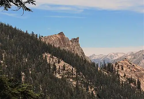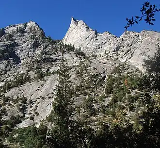 The Sphinx is a 9,143-foot-elevation (2,787-meter) double summit granitic pillar located west of the crest of the Sierra Nevada mountain range, in Kings Canyon National Park, in Fresno County of northern California.[3] This landmark is situated at the northern end of the Great Western Divide, two miles southeast of Kanawyers, five miles northwest of North Guard, and immediately south of the confluence of Bubbs Creek and South Fork Kings River. Topographic relief is significant as the north aspect rises 4,000 feet (1,200 meters) above the canyon in one mile. This geographical feature was named in 1891 by John Muir.[4] This feature's name has been officially adopted by the United States Board on Geographic Names.[3] The Sphinx formation is the further north and slightly lower of the two peaks, and was the first rock climb done in the Kings Canyon region.[5] The first ascent of the summit was made July 26, 1940, by Art Argiewicz and Bob Jacobs.[6] The North Buttress was first climbed October 18, 1970, by Fred Beckey, Greg Donaldson, and Walt Vennum.[7]