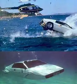 In October, the second unit travelled to Nassau to film the underwater sequences. To create the illusion of the car becoming a submarine, seven different models were used, one for each step of the transformation. One of the models, designed by Derby marine engineer Alex Leam, was a fully mobile submarine, "Wet Nellie", equipped with an engine built by Miami-based Perry Submarines. The car seen entering the sea was a mock-up shell, propelled off the jetty by a compressed air cannon, whilst the first underwater shot of the car was a miniature model filmed in a test tank. Three full-size bodyshells were used to depict the actual car-to-submersible transition. During the model sequences, the air bubbles seen appearing from the vehicle were created by Alka-Seltzer tablets[5] or from divers driving the submarine, who were hidden by the black louvres of the Esprit in submarine mode.[39]