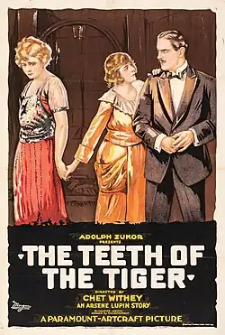 The Teeth of the Tiger is a 1919 American silent comedy film directed by Chester Withey and written by Roy Somerville based upon a novel of the same name by Maurice Leblanc. The film stars David Powell, Marguerite Courtot, Templar Saxe, Myrtle Stedman, Joseph Herbert, Charles L. MacDonald, and Riley Hatch. The film was released on November 2, 1919, by Paramount Pictures.[1][2]
