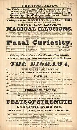 - ^ a b Playbill for Theatre, Leeds, Monday 22 September 1834. See File:Ching Lau Lauro 1834.jpg