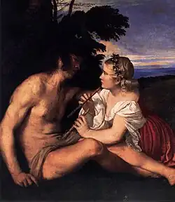 X-Rays of the painting indicate a large number of pentimenti within the composition, even for Titian's standards.[3] Titian had originally painted the woman's head slightly facing the spectator, but ultimately decided to paint her in a pure profile pose to display a more consuming engagement with her lover.[5] Her lover sits with his back arched similarly to the old man in the center of the composition, who is representative of old age, loss, and "the vanity of earthly existence" according to art historian Judith Dundas.[6] The old man, looking very much like the penitent Jerome, is contemplating a pair of skulls, which by implication, are of former lovers. Titian had originally painted more skulls surrounding the old man.[5] Scholars note that in other lost versions of the composition the extra skulls may have been left present, seeing as the Sassoferrato copy of the composition includes them, but they were painted over by Titian in the Sutherland copy, presumably to emphasize the dualism of the lovers or to reduce any unnecessarily macabre tones.[2][5] The church in the background may serve to remind viewers of the Christian promise of salvation and eternal life.[7][8]