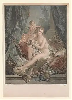 While The Toilet of Venus was on the market in 1782, it was engraved by Jean-François Janinet and published by Jacques Chereau. The engraving was dedicated to Madame de Coislin, who had been in competition against Madame de Pompadour for the position of King Louis XV's mistress. This dedication may have been intended ironically, given Madame de Pompadour's personal identification with the painting and the role of Venus.[3][6]
