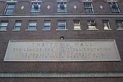The middle stories generally lack window openings and are faced in brick.[19] The center of the facade has a limestone plaque that contains the words "The Town Hall / Founded by / the League for Political Education / 1894–1920 / 'Ye Shall Know the Truth and / the Truth Shall Make You Free'".[20][22] On either side are two empty niches surrounded by limestone frames.[20] The niches are topped by round arches and contain similar keystones to the openings below them.[19][23] There are light fixtures at the bases of the niches,[24] as well as on the sills of the round arches.[23] Above the niches and plaque is a set of sash windows with brick and limestone frames. A Greek key band course runs above the middle stories.[20]