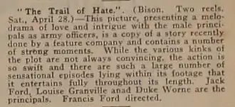 - ^ "Bison / THE TRAIL OF HATE", The Moving Picture World, April 28, 1917, pp. 675-676. Internet Archive. Retrieved April 28, 2020.