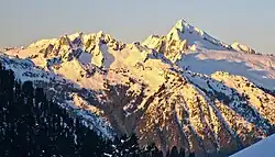 The Triad is a mountain with three peaks located in the North Cascades, in Skagit County of Washington state.[5] Situated in North Cascades National Park, The Triad is positioned west of the crest of the Cascade Range, approximately 12 miles east of the town of Marblemount. The middle peak (highest) has an elevation of 7,520+ ft (2,290+ m), the west peak 7,440+ ft (2,270+ m), and the east peak 7,520+ ft (2,290+ m).[1] The popular hiking objective, Hidden Lake Peak Lookout, lies three miles to the southwest, and the nearest higher peak, Eldorado Peak, two miles to the northeast, is a popular mountaineering objective.[1] Precipitation runoff from The Triad drains into tributaries of the Cascade River which in turn is a tributary of the Skagit River. The first ascent of the mountain was made in 1949 by Dick Eilertsen, Dick Lowery, Dick Scales, and Don Wilde. This climbing party which had three identical first names, named it the Three Dicks. However, in the interest of good taste, the more suitable and similar name was adopted since "triad" means a group or set of three connected people or things.[3]