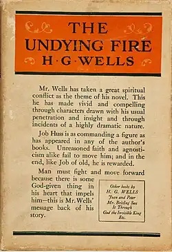 The Undying Fire, a 1919 novel by H. G. Wells, is a modern retelling of the story of Job. Like the Book of Job, it consists of a prologue in heaven, an exchange of speeches with four visitors, a dialogue between the protagonist and God, and an epilogue in which the protagonist's fortunes are restored. The novel is dedicated "to All Schoolmasters and Schoolmistresses and every Teacher in the World."