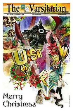 The Varsitarian (Varsi, The V, or V) is the official student publication of the University of Santo Tomas (UST). Founded in January 1928 by a group of students led by Jose Villa Panganiban, it is one of the first student newspapers in the Philippines. It is published fortnightly. The lampoon issue is called The Vuisitarian. Tomas U. Santos, the mascot of The Varsitarian, is a Thomasian who represents the students of the campus. He is usually seen accompanied by a talking, and quite cynical, T-square.