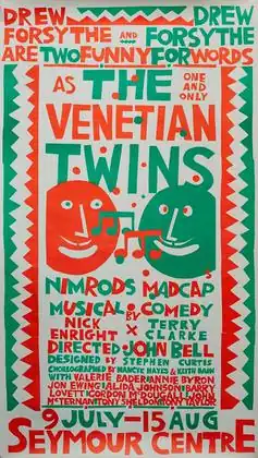The Venetian Twins premiered on 26 October 1979 in the Drama Theatre of the Sydney Opera House.[1] The Nimrod Theatre Company production was directed by John Bell and designed by Stephen Curtis for the inaugural season of the Sydney Theatre Company. It starred Drew Forsythe as the twins, coloratura soprano Jennifer McGregor (for both of whom their rôles were specifically written). Tony Sheldon, Tony Taylor, Jon Ewing (as Pancrazio, the villain), and others.[2]