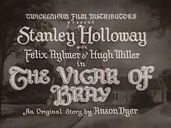 The Vicar of Bray is a 1937 British historical film with songs, directed by Henry Edwards, and starring Stanley Holloway, Hugh Miller, Felix Aylmer and Margaret Vines.[1] These songs include the melody and first verse of the traditional English song which gives the film its title, along with a new verse on Cromwell's rule.
