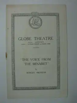 The Voice from the Minaret is a play by the British writer Robert Hichens. It premiered at the Globe Theatre in London's West End in 1919, with a cast including Marie Lohr, Arthur Wontner, Henry Vibart, Norman McKinnel, George Hayes and Vane Featherston. In 1922 it was staged on Broadway at the Hudson Theatre with Lohr and Herbert Marshall heading the cast, and Edmund Gwenn receiving the best reviews.[1]
