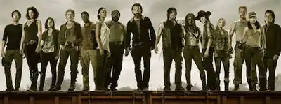 The primary characters of the fifth season include (from left to right): Glenn, Maggie, Tara, Carol, Bob, Sasha, Tyreese, Rick, Daryl, Michonne, Carl, Beth, Abraham, Rosita, and Eugene; absent: Gabriel and Gareth