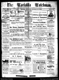 The Warialda Watchman was a weekly English-language newspaper published in Warialda, New South Wales, Australia. This newspaper was published by Alfred Wiskens from 12 January 1899 and is believed to have ceased publication in the same year.[1][2] Some issues were published with supplements.[1]