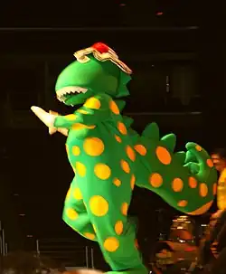 Dorothy the Dinosaur is a "rososaurus", a "yellow-spotted green herbivorous dinosaur (ornithischian) with surprisingly scary teeth".[1] She lives in a pink and purple house with her own Rosy Orchestra and a rose garden in her backyard. She loves to eat roses and dance the ballet.[1] She enjoys serving guests rose-derived treats such as "rosy-posy tea".[2] She also has a distinctive, trill-like, descending laugh. She was the first character to be introduced, in 1991.