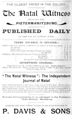 He seems to have functioned throughout his many years in the colony of Natal as both a lawyer, advocate and the most enduring of the colony's newspapermen. It was this connection with the law which led to the choice of “witness” in the name of the paper. This was further underlined by the paper's masthead which read: “The Whole Truth and Nothing but the Truth”.