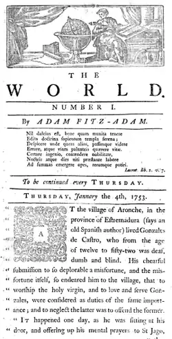 The World (1753–1756) was a London 18th century weekly newspaper. Contributors included Edward Moore, Horace Walpole, E. S. Dallas, and Charles Hanbury Williams.[1][2][3]