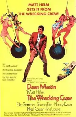 The Wrecking Crew is a 1968 American spy comedy film directed by Phil Karlson and starring Dean Martin as Matt Helm, along with Elke Sommer, Sharon Tate, Nancy Kwan, Nigel Green, and Tina Louise. It is the fourth and final film in the Matt Helm series, and is loosely based on the 1960 novel of the same name by Donald Hamilton. The film opened in Canada in December 1968 before premiering in the United States in February 1969.[2]