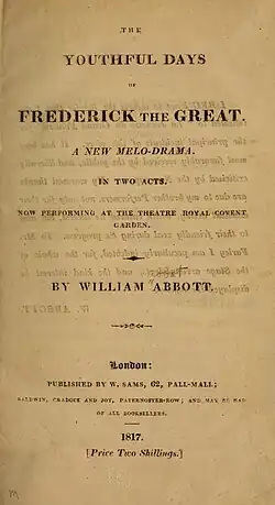 The Youthful Days of Frederick the Great is an 1817 stage melodrama by the British writer and actor William Abbot. It premiered at the Theatre Royal, Covent Garden in London on 2 October 1817.[1][2] The cast included Daniel Terry as Frederick William, King of Prussia, Abbot as The Prince Royal, Daniel Egerton as Baron Kniphausen, Chapman as Count Seckendoff, Charles Connor as Anhalt, Charles Farley as Frederstoff and Harriet Faucit as Christine.
