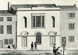 In 1766, a disused silk mill on French Street was converted into a theatre, which came under the management of John Collins in the 1770s.[2] Collins, an actor who also ran theatres in Chichester and Salisbury, acquired the site of the old St John's Hospital on French Street in 1798.[2] He built a new theatre, designed by an architect named Mr Slater, which finally opened five years later on 12 September 1803.[2][5] Billed as the "Southampton New Theatre, Built on the exact Model of the Theatre-Royal Drury-Lane",[6] the opening was well attended and well received.[5] The Hampshire Chronicle applauded "the liberal and spirited manner" in which the building had been decorated, adding that "a more elegant, convenient, and brilliant Theatre is not to be met out of London."[5] After Collins's death in 1807, the theatre was run by his sons Stephen and Thomas, and his son-in-law Henry Kelly.[2]
