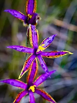 Thelymitra speciosa, commonly called the eastern Queen of Sheba,[2] is a species of orchid in the family Orchidaceae and endemic to the south-west of Western Australia. It has a single erect, spiral, dark green leaf with a purplish base and one or two glossy, purplish flowers with broad reddish edges and yellowish margins. There are two bright yellow or orange arms on the sides of the column.