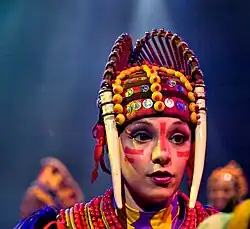 The show is performed inside an enclosed theater-in-the-round. Guests sit in four sections, each designated with an animal name: Giraffe, Elephant, Warthog, Lion. These animals are represented by large puppets on parade-style floats, which were originally built for Disneyland's The Lion King Celebration parade.[3] The show is hosted by four performers dressed in costumes inspired by traditional African dress. Each has a Swahili name: Kiume (meaning "masculine and strong"), Nakawa ("good-looking"), Kibibi ("princess"), and Zawadi ("the gift").