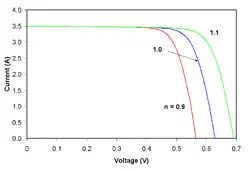 Most solar cells, which are quite large compared to conventional diodes, well approximate an infinite plane and will usually exhibit near-ideal behavior under standard test conditions (n ≈ 1). Under certain operating conditions, however, device operation may be dominated by recombination in the space-charge region. This is characterized by a significant increase in I0 as well as an increase in ideality factor to n ≈ 2. The latter tends to increase solar cell output voltage while the former acts to erode it. The net effect, therefore, is a combination of the increase in voltage shown for increasing n in the figure to the right and the decrease in voltage shown for increasing I0 in the figure above. Typically, I0 is the more significant factor and the result is a reduction in voltage.