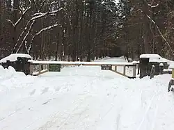 Although the park was originally developed with a campground, it is now a day-use park with hiking trails. The road passes through a CCC-built gate, and runs nearly directly west, passing a wood-frame ranger contact station, near which a road branches south to a campground area formerly used by a summer camp. From the contact station, a road reaches Sunset Hill, a former picnicking area that now houses an outdoor classroom for Thetford Academy. The road is crossed and recrossed several times by the Woods Hill Trail, a multi-use hiking and cross-country ski trail that extends onto the Thetford Academy campus. Near the parking area are also the fragmented remains of a CCC-built campground, in which little more than stone fireplace and dilapidated restrooms are to be found.[3]