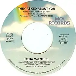 "They Asked About You" is a song written by Freddy Weller, Bill Nash, and Kim Nash. It was recorded by American country music artist Reba McEntire and was released in December 1993 as the second and final single from her second compilation album for MCA Records, Greatest Hits Volume Two (1993). The song reached number seven on the US Billboard Hot Country Singles & Tracks chart in March 1994.[1]