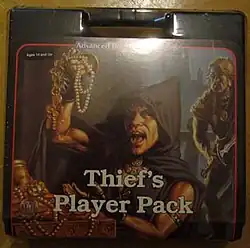 The Thief's Player Pack is an AD&D game accessory which comes in a case with everything a newcomer needs to get his thief PC ready for a campaign: a pad of character sheets, a stand-up reference screen, a brief but informative player's guide, seven polyhedral dice, three pewter miniatures, and a shiny red pencil. The case is designed so that a copy of the Player's Handbook can fit snugly inside the lid.[1]