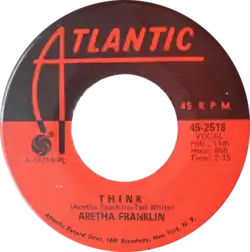 "Think" is a song written by American singer Aretha Franklin and Ted White, and first recorded by Franklin. It was released as a single in 1968, from her Aretha Now album. The song reached No. 7 on the Billboard Hot 100, becoming Franklin's seventh top 10 hit in the United States. The song also reached number 1 on the magazine's Hot Rhythm & Blues Singles,[6] becoming her sixth single to top the chart. Franklin re-recorded the song in the Atlantic Records New York studio for the soundtrack of the 1980 film The Blues Brothers and in 1989 for the album Through the Storm. Pitchfork placed it at number 15 on its list of "The 200 Greatest Songs of the 1960s".[7]