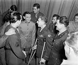 In January 1944, Berlin skipped the first performance of This Is the Army in Bristol, to visit and bring back a hospitalized bombardier and former Broadway hoofer who lost his leg in battle. The airman is shown here, visiting old friends backstage.[8]