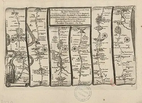 After much difficulty, since most of the town's records were lost, Gardner published in 1754 by subscription An Historical Account of Dunwich, antiently a city, now a borough; Blithburgh, formerly a town of note, now a village; Southwold, once a village, now a Town-corporate; with remarks on some places contiguous thereto. … Illustrated with copperplates. Prefixed to some copies is a modernised version of Agas's plan by Joshua Kirby. Agas's report of the state of the town and harbour referred to above is printed from the original manuscript then in Gardner's possession on pp. 20–2.[2]