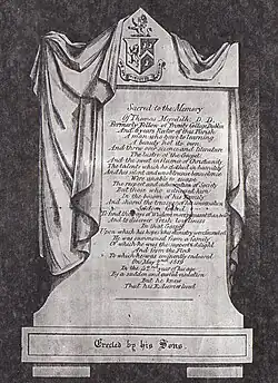 The poet, Charles Wolfe, was much attached to, and a great admirer of Thomas Meredith. Wolfe was the author of the inscription on Meredith's memorial at the Church of Ardtrea and a previously unpublished epitaph for his tomb. The memorial is made of black and white marble and is surmounted by the Meredith family crest and coat of arms: