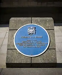 A Blue plaque for Thomas de la Warre outside Manchester Cathedral