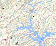 Thompson Creek rises in eastern Dawson County, just west of U.S. Route 19/State Route 400 and just north of State Route 53, and southeast of Dawsonville.[2] The creek heads southeast for less than a half a mile, then crosses US 19/SR 400 and heads south along the highway, before turning east and forming the Thompson Creek arm of Lake Lanier, which is the westernmost arm of the lake, just east of SR 400. This arm also receives one additional unnamed branch coming from the south, before Thompson Creek meets the Chestatee River, which is submerged under Lake Lanier at the point of their confluence at the intersection of the Chestatee and Thompson Lake Lanier arms.[3]