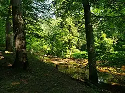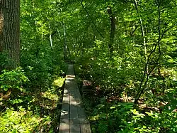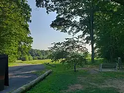 The nature reservation at Thompson Park totals about 925 acres (374 ha) and stretches from the main section of Thompson Park on Schoolhouse Road to the Gravel Hill. The heavily wooded reservation is located along the Manalapan Brook, with some of the land still being utilized by local farmers in cultivating crops.[13] The reservation features roughly 9 miles (14 km) of easy-to-moderate trails.[14][15] There are two main trails, the main 8-mile (13 km) Hoffman Station trail connects to the rest of Thompson Park through open fields and is considered easier. The shorter Gravel Hill trail traverses through hills and forestland, but is considered harder.[15] Other activities such as walking, bird watching, and photography.[14] Hunting is also allowed along the heavily forested Gravel Hill trail, but not on the more open Hoffman Station trail.