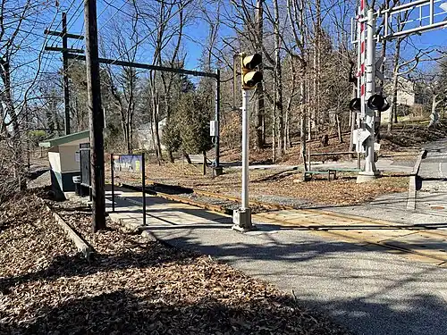 Trolleys arriving at this station travel between 69th Street Transit Center in Upper Darby Township, Pennsylvania and Orange Street in Media, Pennsylvania. The station has a shed with a roof where people can go inside when it is raining. This shed is a traditional "Red Arrow" shed located in an area that's both wooded and residential. Because of this, no parking is available at this station.[1] Trailheads for Thomson Park are located near the station. Thomson Avenue climbs a hill on the west side of this stop as it prepares to terminate at Springfield Hospital on Sproul Road (PA 320), which has a stop of its own at Springfield Mall.