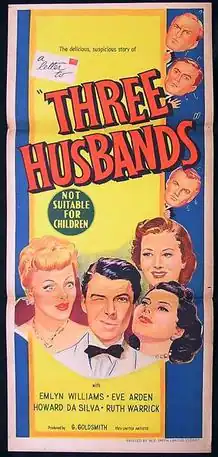 Three Husbands is a 1951 American comedy film directed by Irving Reis and starring Eve Arden, Ruth Warrick, and Emlyn Williams.[1][2]