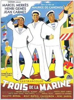 Three Sailors (French: Trois de la marine) is a 1957 French comedy film directed by Maurice de Canonge and starring Marcel Merkès, Henri Génès and Jeannette Batti.[1] The film was made at the Victorine Studios in Nice with sets designed by the art director Claude Bouxin. It was shot in Eastmancolor.