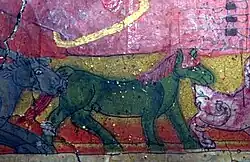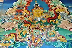Most Tibetan Buddhist monasteries, temples and other religious structures in the Himalayas were decorated with Tibetan Buddhist wall paintings. Despite much destruction in Tibet itself, many of these survive, the dry climate of the Tibetan plateau assisting their survival, as the wet Indian climate has reduced survival of paintings from there. There are some regional differences, but the techniques described here cover the traditional wall paintings across this area. The wall paintings were executed on earthen plaster with the secco-technique.[1] A secco-technique is a painting technique in which the pigments with their binder are employed to paint onto a dry (Italian: secco) wall.[2]